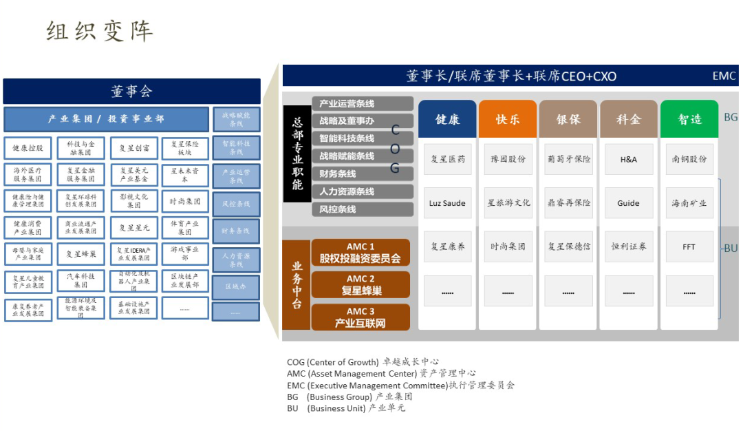 原来整个投资驱动的各块独立的组织架构,进化为能够横向到边、纵向到底、节节贯穿的生态组织,包括在横向成立的健康、快乐、银保、科金、智造五个BG(事业群),每个分类下边又有产业集团,产业集团下边又有旗舰企业,例如健康旗下有复鑫医药,快乐旗下有豫园股份……每个产业集团旗下还有自己的多产业的发展,形成纵向组织。横向方面,将我们的投融团队、蜂巢团队、产业互联网团队打穿,使得整个组织形成到边到底、贯穿式的生态组织。