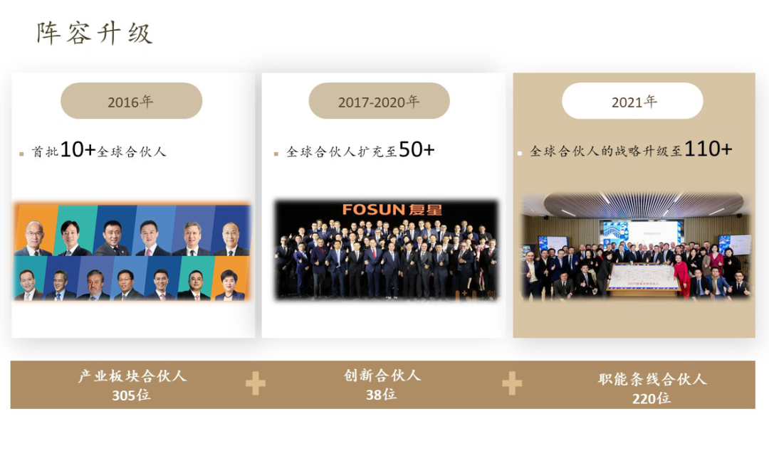阵型的背后是阵容。复鑫最重要的财富是合伙人模式,包括复鑫顶层的全球合伙人。从最早2016年18位全球合伙人到现在已经有110多位全球合伙人。特别是今年年初,我们从各个产业和条线提拔了60多位复鑫全球合伙人,目的是要C端置顶,要为家庭打造生态,所以需要更多合伙人置顶,一起打更大的战役。