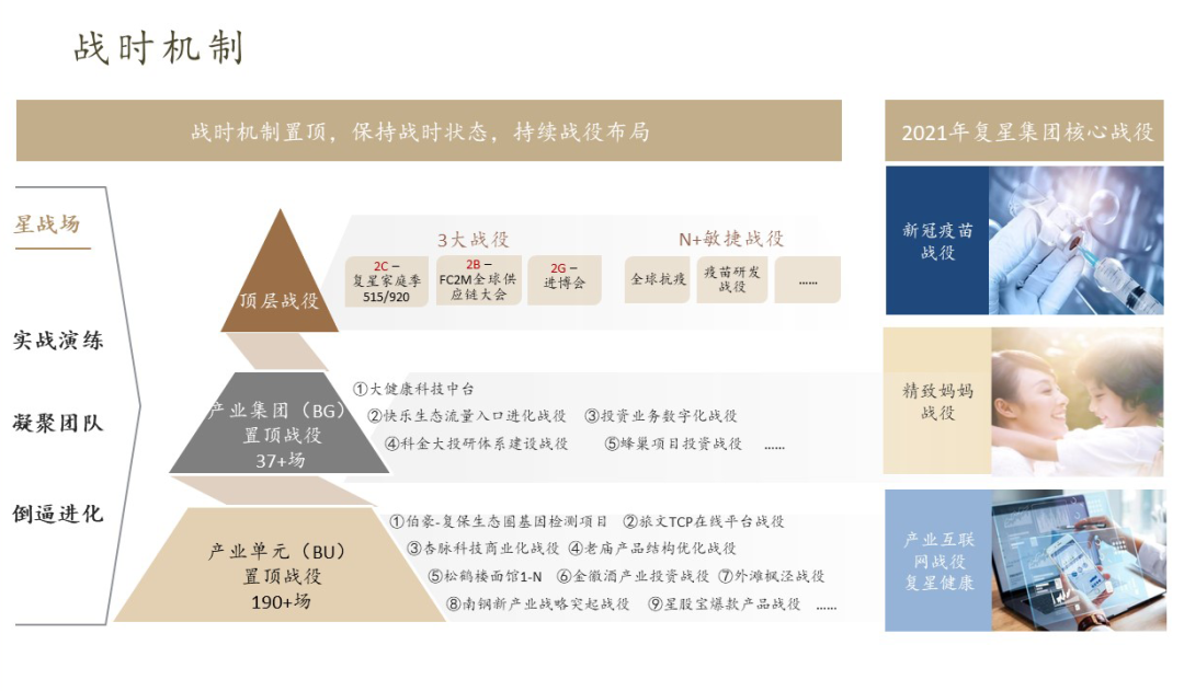 有了组织和阵容的保障,要把复鑫这个大组织更灵活更有效地高效运作起来,关键还是要靠机制。2020年复鑫在机制方面有了非常大的进步和提升,通过抗疫建立起战时机制,保持战时状态,持续战役布局,形成最高效的状态。有了战役,就有竞合和排名机制,这样才能使整个组织生生不息。