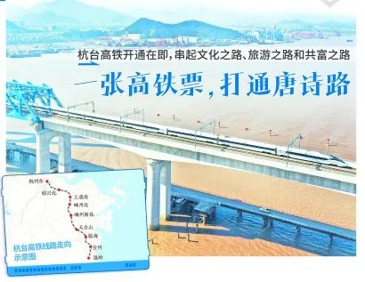 杭台高铁打通了这条诗路的最后关节,有了时速350公里的交通工具,不仅能服务沿途居民,更能迎来送往更大范围内的游客。杭绍台铁路有限公司党委副书记马绍贵认为,杭台高铁不仅是快捷通道,更是文化之路、旅游之路和共富之路。天台县有了新广告语:飞腾直欲天台去,只要一张高铁票,幽默地用了诗仙李白形容天台山“龙楼凤阙不肯住,飞腾直欲天台去”诗句。
