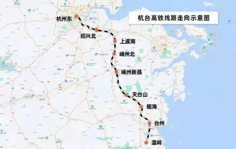 杭台高铁连接着杭州、绍兴、台州三地,它北起杭州东站,利用杭甬高铁至绍兴北站既有线,之后新建终至台州市温岭站的正线,设计时速350公里,线路全长约266.9公里,其中新建线路约226.3公里,设绍兴北、上虞南、嵊州北、嵊州新昌、天台山、临海、台州、温岭等车站,将结束嵊州、新昌、天台3县市不通铁路的历史。1月10日铁路调图后,杭州至台州最快运行时间为1小时3分钟,较现行经由杭深高铁最快运行时间压缩47分钟;上海至台州最快运行时间为1小时51分钟,上海至温州等地的时间也将缩短。
