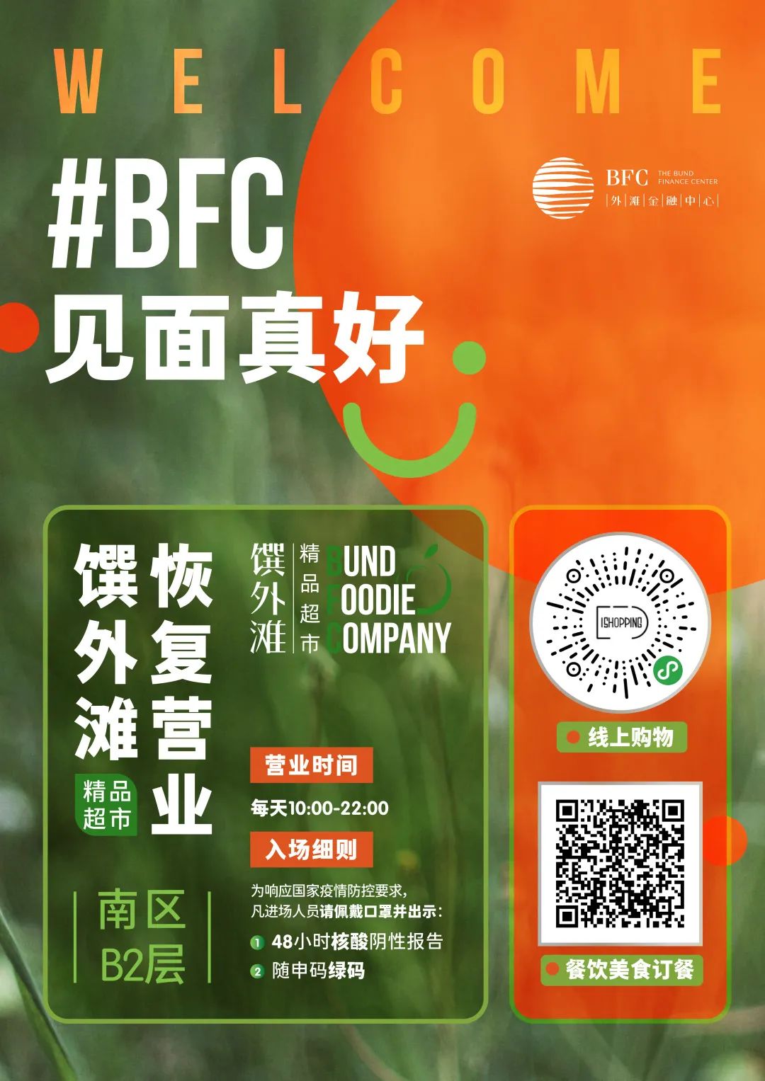 根据防疫要求,顾客前往BFC商场需持有48小时内核酸阴性报告和随申码绿码,佩戴好口罩,从BFC东门路入口进入,可沿指示牌路线进入商场。