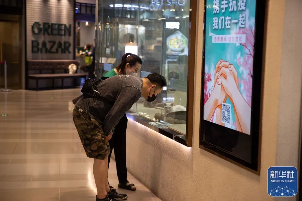 在BFC外滩金融中心,消费者被PET WISH橱窗里的一只宠物猫吸引。