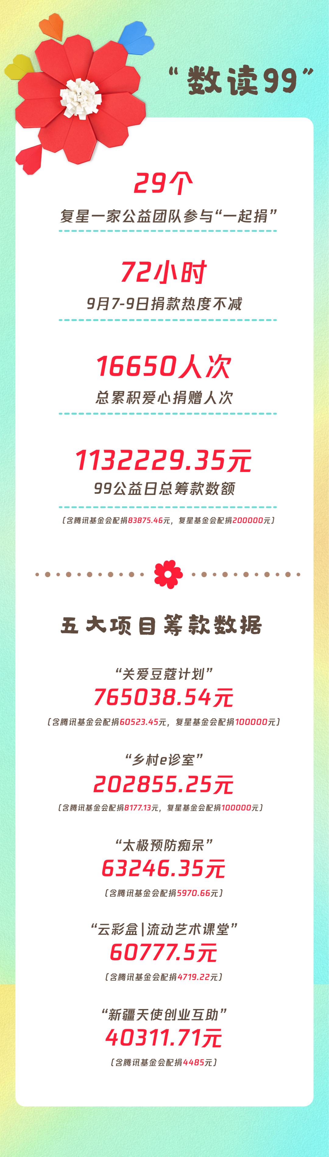 虽然“99公益日”暂时告一段落,但“一块做好事”的公益精神还将继续。复鑫基金会将与公益伙伴一道开启项目执行工作,定期对公众同步5大项目的进展情况。