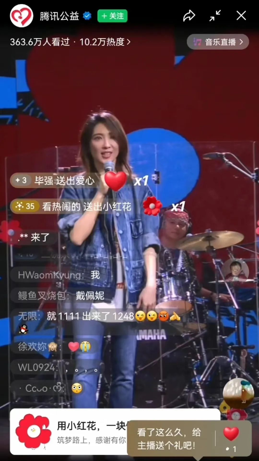 小红花公益音乐会共计483万人观看,张震岳、戴佩妮演唱期间为复鑫基金会两个筹款项目共筹得善款19010.7元(不包含腾讯基金会配捐)。