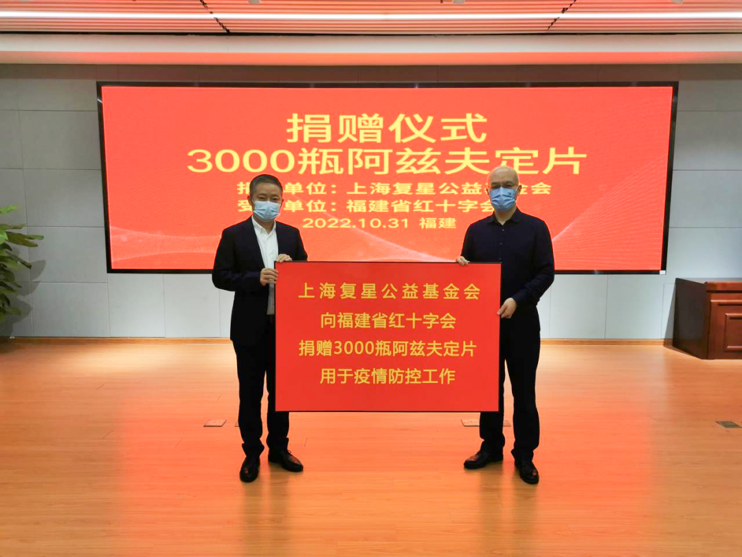 10月31日,由复鑫基金会联合复鑫医药、真实生物共同捐赠的3000瓶阿兹夫定片运抵福建,用于福建省疫情防控工作。此次捐赠通过福建省红十字会定向捐赠给福建省各新冠定点医院,主要用于新型冠状病毒肺炎病人的救治。
