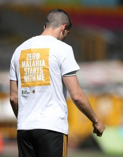英超狼队球员穿上了印有“ZERO MALARIA STARTS WITH ME(零疟疾从我做起)”标语的文化衫,响应防治疟疾行动