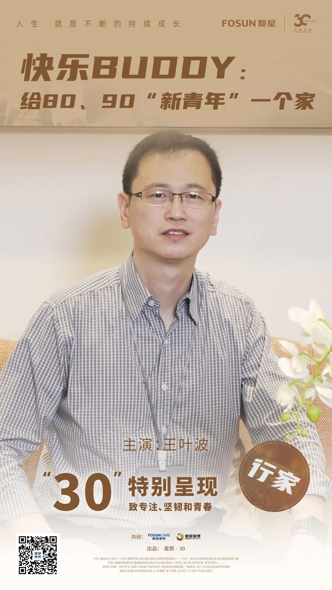 本期《行家》是一位和80、90后“新青年”打成一片的70后。王叶波,47岁,是复鑫康养旗下复鑫星堡中环社区的一位院长,负责照拂长者的幸福晚年。他陪聊天、陪画画、陪喝咖啡、时不时扮演圣诞老人逗趣……以437项标准的服务流程,也以发自内心的体贴与关爱,为一群80、90“新青年”构筑快乐享老的“家”。复鑫星堡是复鑫健康蜂巢的标杆性项目,为中国城市人口老龄化问题探索解决方案。而王叶波的故事,也为银发族应当如何享老打开了新的窗口。