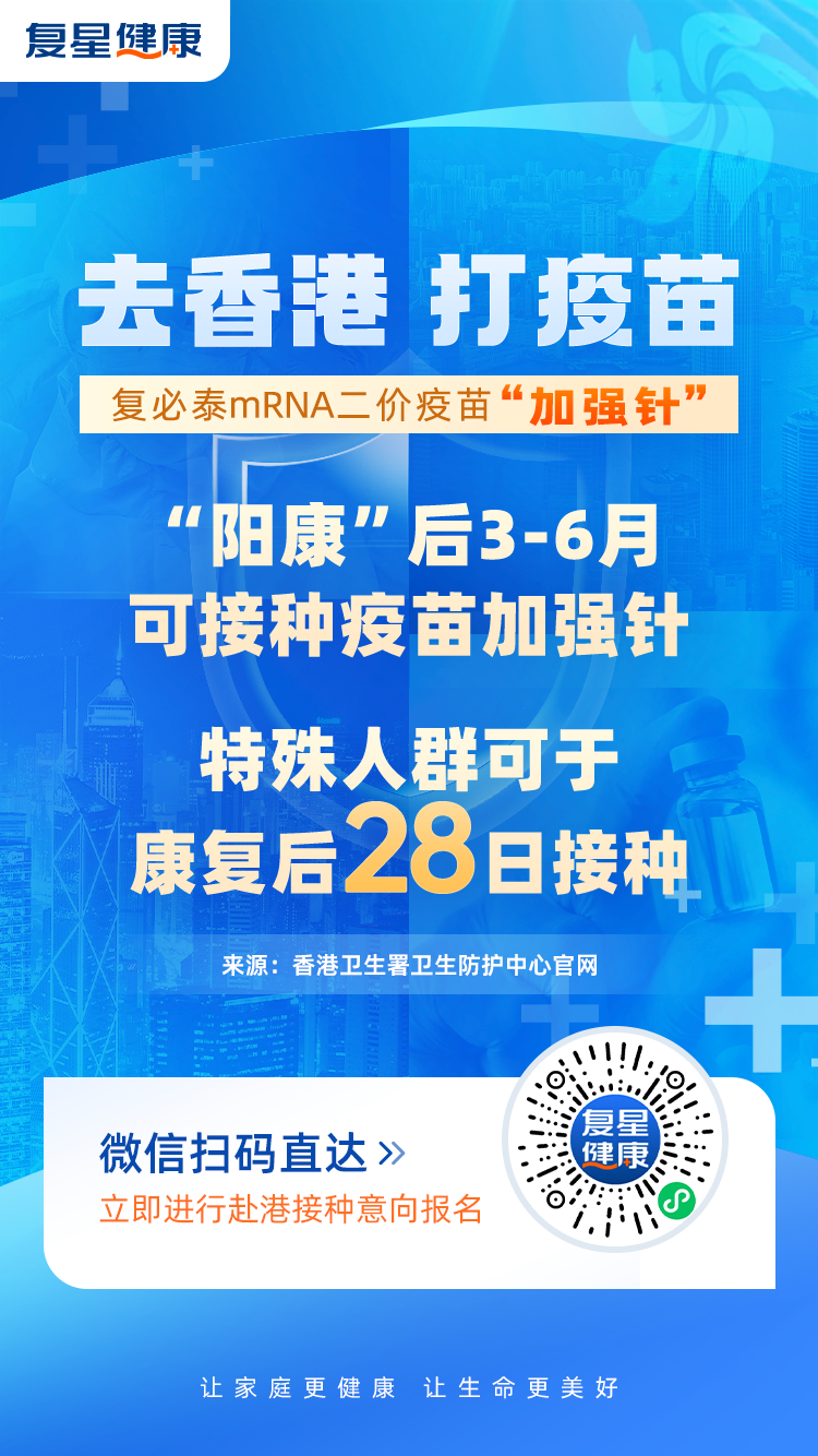 用户可登录复鑫健康小程序/APP,在首页入口找到“复必泰二价疫苗”,或打开京东APP搜索“复必泰加强针”、支付宝App搜索“阿里健康疫苗”,即可进行个人赴港接种意向报名。待客服短信通知报名成功后,用户可前往香港自费接种复必泰二价疫苗。