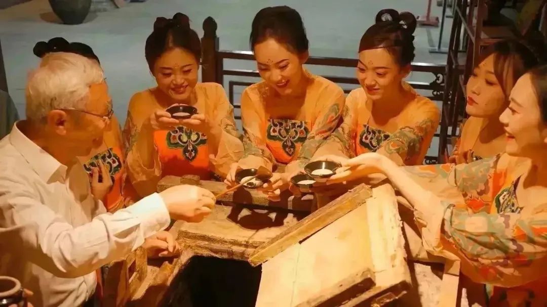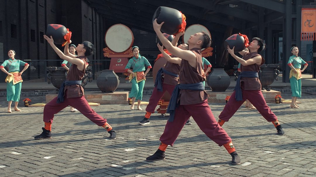 舍得的“酿酒工人们”用身姿将一杯老酒的酿造历程生动还原。金徽的唐宫小姐姐们,则在微醺中上演了好一出穿越大戏。