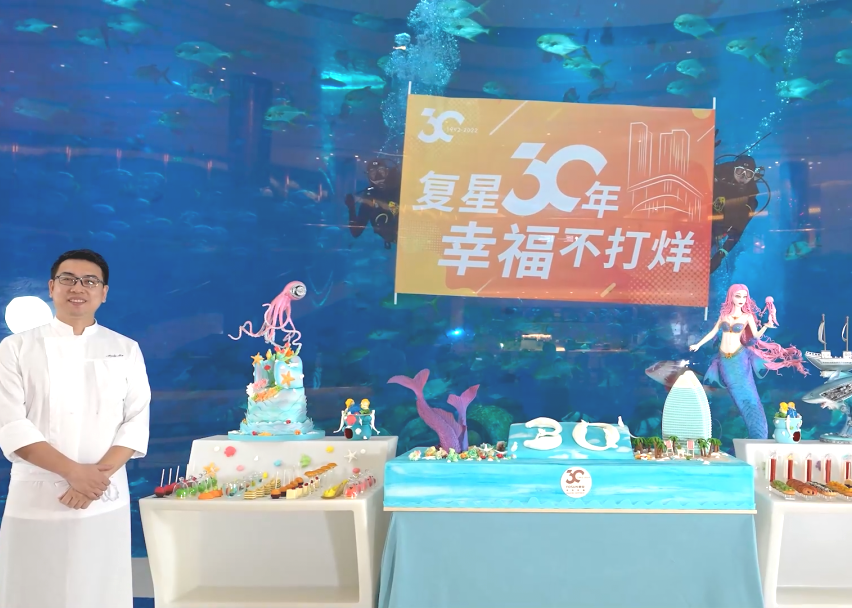 三亚·亚特兰蒂斯的西饼房行政总厨马宗强师傅,花费了一周时间准备了一个巨型翻糖蛋糕,用海洋元素和特别的“30”施展了创意魔法。另一边的上海豫园,来自绿波廊的国家级点心大师陆亚明呈现了一盘别致的“复鑫高照”,巧手捏制出栩栩如生的柿子、核桃和苹果,代表事事如意、和和美美、平平安安。
