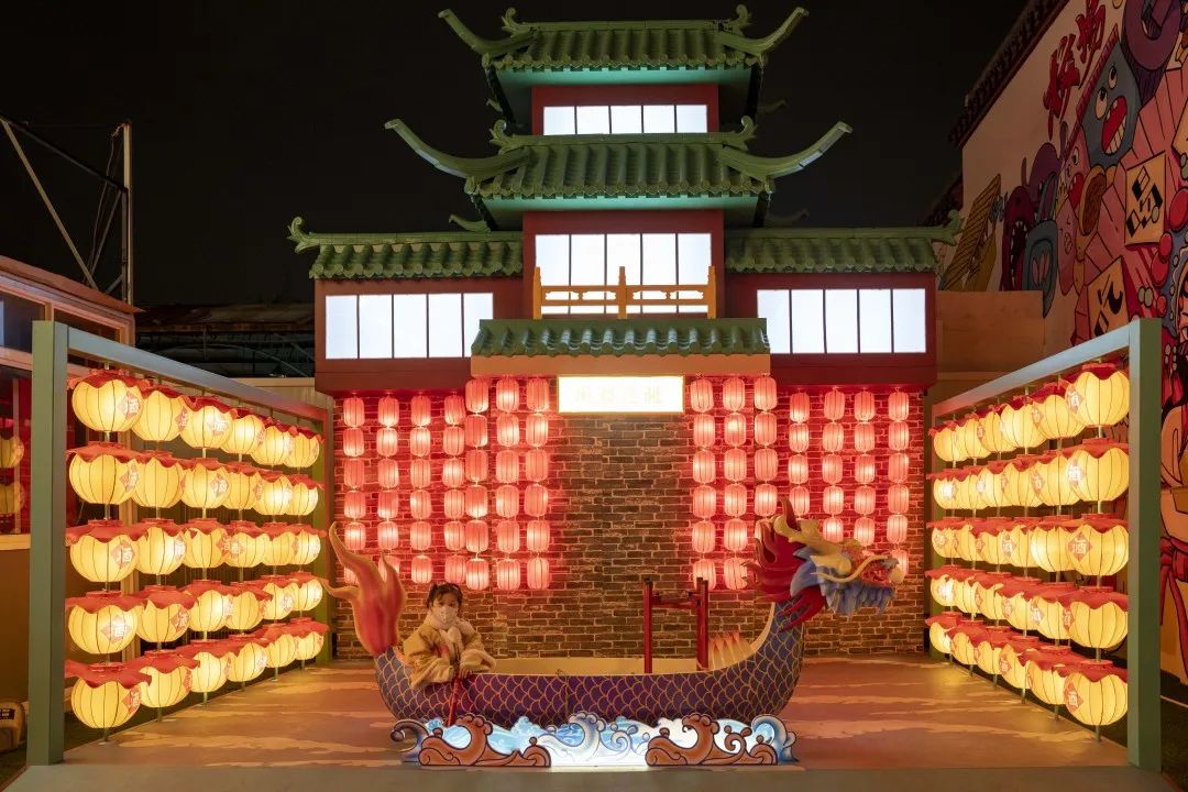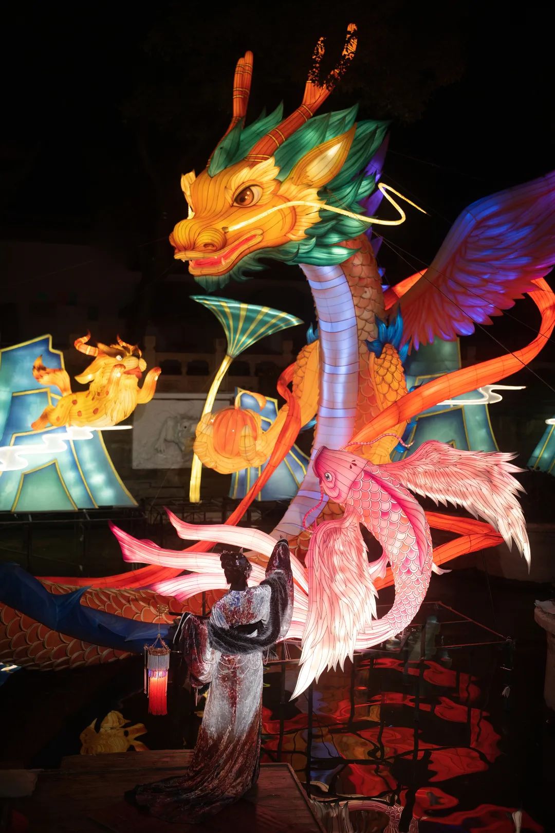 门头“空中龙门”灯组,源自李在名画《琴高乘鲤图》,锦鲤、龙门、江涛,画中元素以灯彩形式重现,祥瑞之气扑你一个满怀。