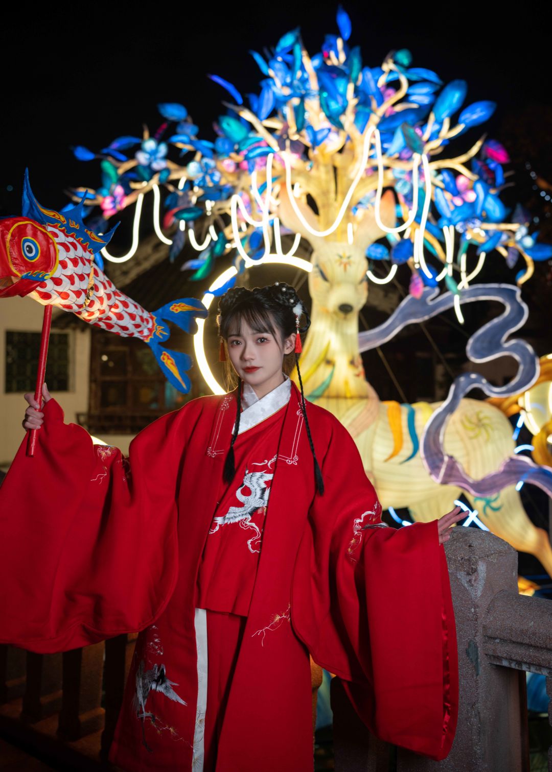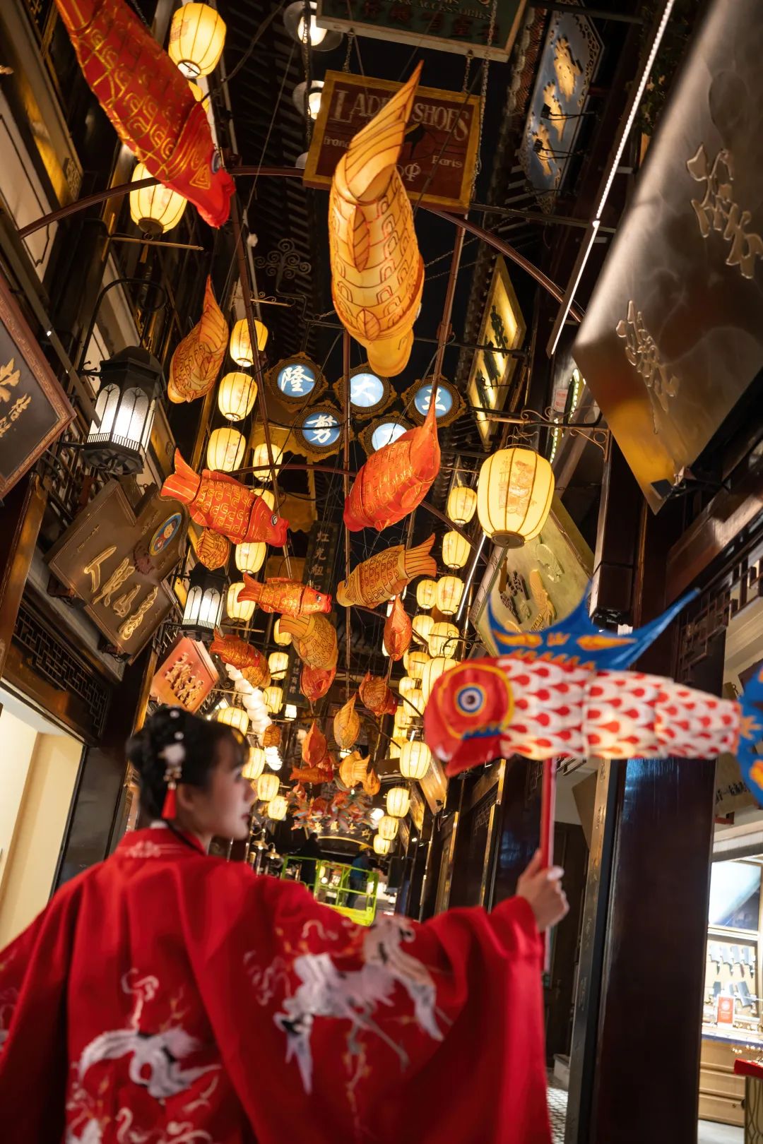 漫步在豫园老街,是“奇豫上博”的联袂呈现,当灯会遇见了博物馆,看灯也能大涨姿势。仰头所见,是无数锦鲤游弋飞跃,仿佛鸿运当头。这些锦鲤各个来头不小,正是出自上海博物馆的馆藏文物珍品。飞鱼氛围灯的灵感来源于“剔红海水飞鱼纹圆盒”中的飞鱼纹;锦鲤氛围灯的呆萌形象,竟是“石舟铭漱金玉鱼佩墨”的同款。