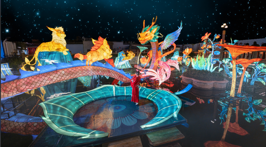 只需轻轻扫码,即可召唤瑞兽——巨鲲在天空遨游,玉兔在檐角跳跃,按下祈福按钮还可写下祝福放天灯;在九曲桥的缥缈幻境里,看神兽总动员,畅游山海。