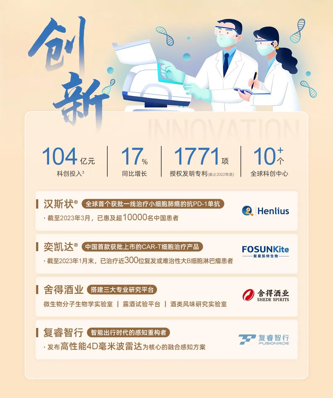 在大健康领域,复鑫在疫苗和创新药方面持续取得进展。复必泰BNT162b2(即mRNA COVID-19疫苗BNT162b2)和复必泰二价(即mRNA COVID-19原始株/奥密克戎 BA.4/BA.5适应性二价疫苗)在香港地区正式注册为药物/产品;13价肺炎球菌结合疫苗(多价联合)在中国大陆进入三期临床阶段(不含港澳台地区;以下同样适用)。上海复宏汉霖的汉斯状(斯鲁利单抗注射液)是全球首个用于小细胞肺癌一线治疗的PD-1单克隆抗体,于2022年3月获批上市。复鑫凯特首个在中国获批上市的CAR-T细胞疗法--奕凯达(阿基仑赛注射液)在上市第一年就被纳入70多个城市的定制商业健康保险。