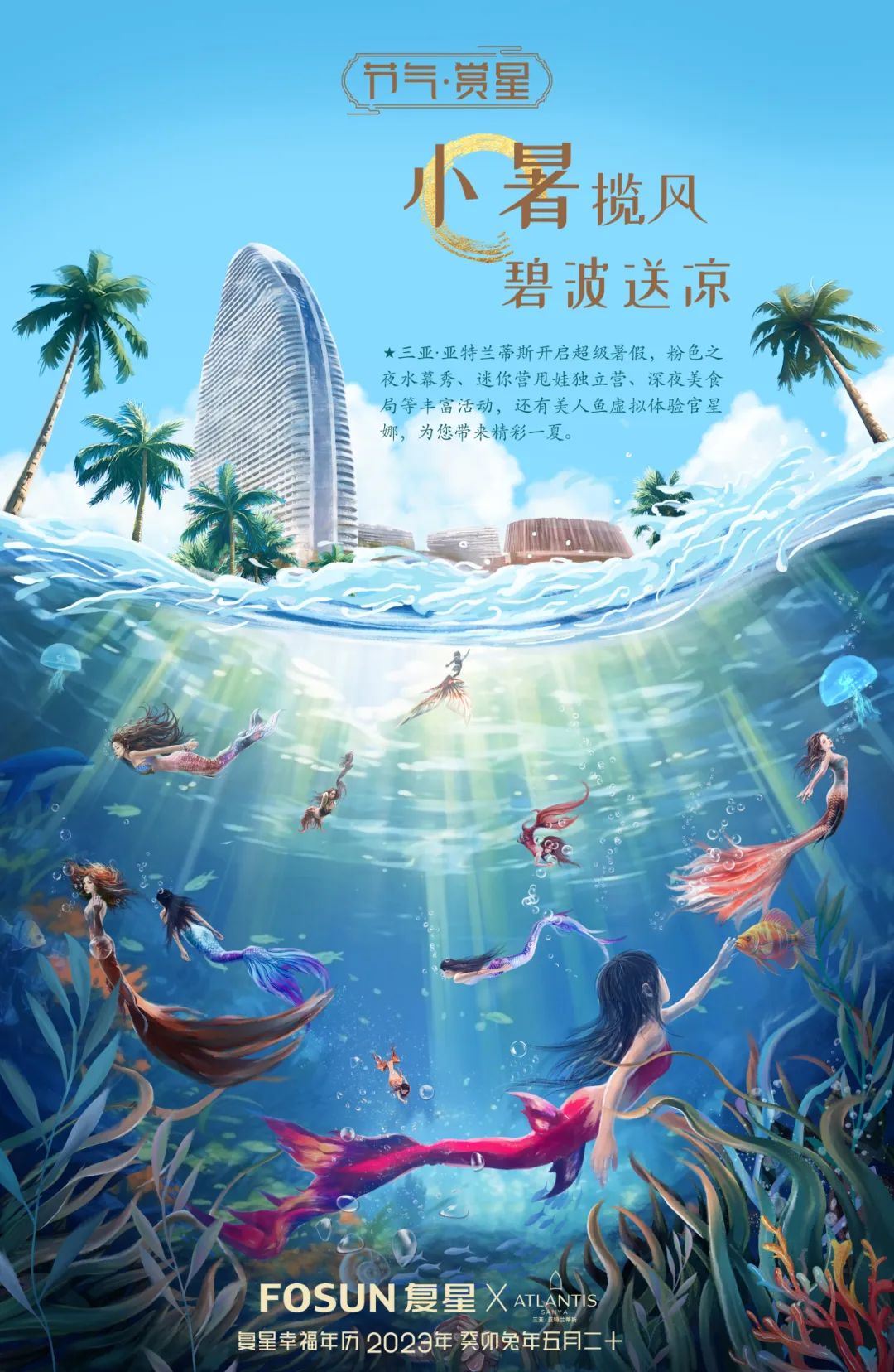 本期节气海报描绘了三亚亚特兰蒂斯的梦幻景象。一群美人鱼自在游弋,浪花送来清凉。7月1日起,三亚亚特兰蒂斯超级暑假正式开启,一系列创新项目引领三亚旅游市场新潮流,促进海南文旅产业数字化进程。粉色之夜水幕秀重磅来袭,以中国首位美人鱼虚拟体验官星娜为主角的唯美短片,为激情夏日拉开序幕;“迷你营甩娃独立营”、“深夜美食局”等丰富业态,涵盖全年龄段客群,无论是亲子游、美食游还是闺蜜情侣游,都将为人们带来精彩一夏。