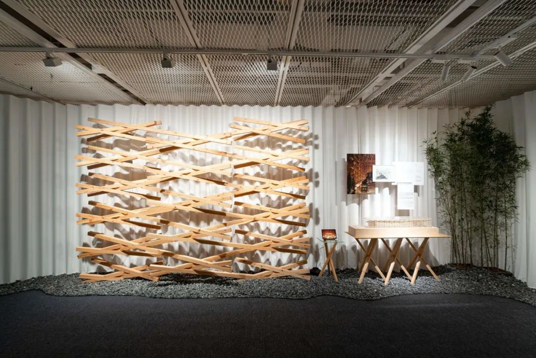 本次展览以“竹”为序章,走进上海复鑫艺术中心一层展厅,入口处是隈研吾全新设计的装置作品《竹涧》,重现了隈研吾内心深处描绘的“原风景”——上万只竹条由可再生、可重复组装的构件所连接,竹的柔韧与重力形成绝妙的平衡,形成竹的曲线,浮于空中。
