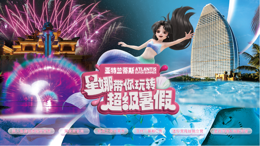 7月1日起,复鑫旅文·三亚亚特兰蒂斯超级暑假正式开启,一系列创新项目引领三亚旅游市场新潮流,促进海南文旅产业数字化进程。粉色之夜水幕秀重磅来袭,以中国首位美人鱼虚拟体验官星娜为主角的唯美短片,为激情夏日拉开序幕;“迷你营甩娃独立营”、“深夜美食局”等丰富业态,涵盖全年龄段客群,无论是亲子游、美食游还是闺蜜情侣游,三亚·亚特兰蒂斯的超级暑假,都将为您带来精彩一夏。