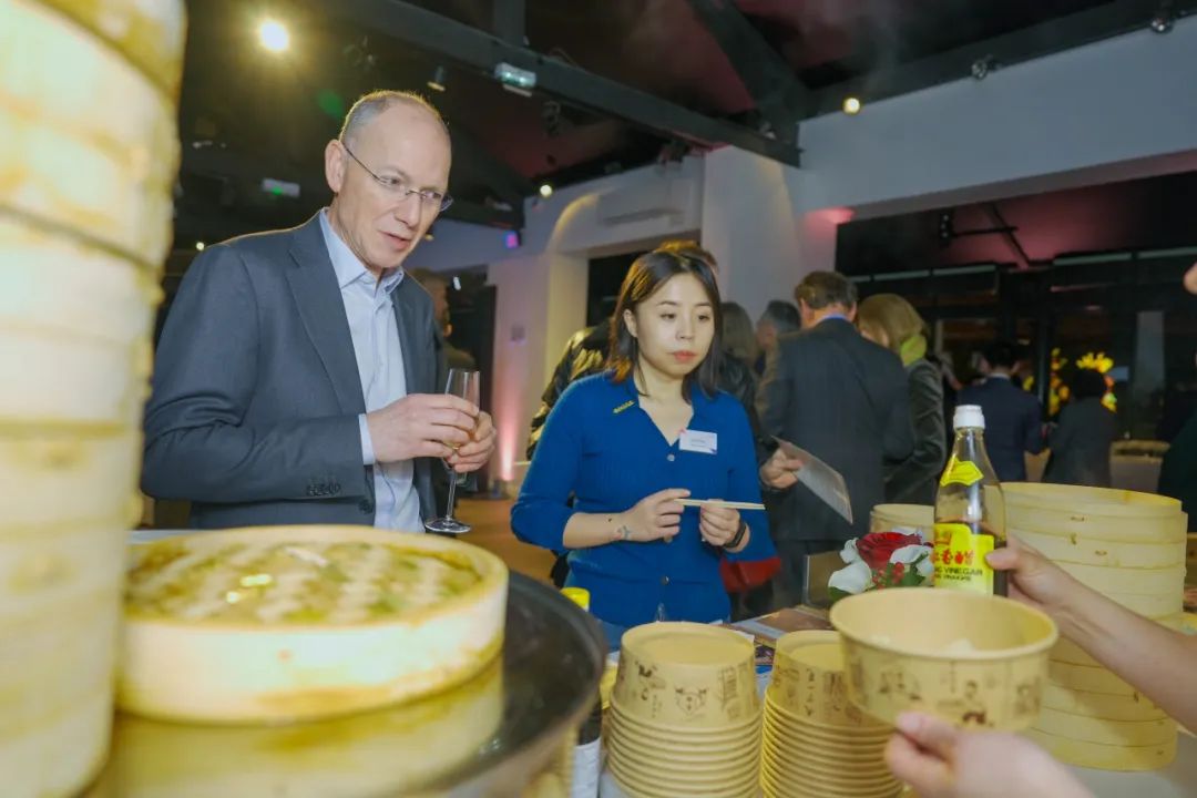 此外,巴黎之夜的展陈、演出、餐食也体现了中西方文化融合的特点。豫园携上海表、海鸥表、童涵春堂等中华老字号品牌来到巴黎风情园,其中童涵春堂的香囊是由苏绣工艺师和法国设计师携手打造,以金穗龙图纹致敬两国长久友谊。各国嘉宾还品尝了南翔馒头店大厨现包现蒸的南翔小笼,中国白酒舍得调制的鸡尾酒,和由St Hubert制作的甜点,给予了高度评价。