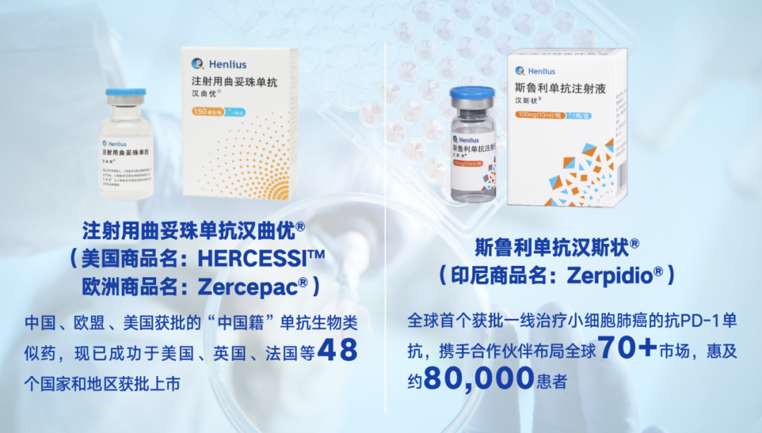 复鑫医药积极推动创新产品出海,以研、产、销一体的全产业链的国际化布局,推动中国产品走向全球。复鑫医药自主研发的汉曲优®(注射用曲妥珠单抗,美国商品名:HERCESSI™,欧洲商品名:Zercepac®)作为获批上市国家和地区最多的国产单抗生物类似药,已在49个国家和地区获批上市,覆盖亚洲、欧洲、拉丁美洲、北美洲和大洋洲,惠及超过21.5万患者,为全球乳腺癌和胃癌患者带去可负担、高品质的治疗选择。自主研发的斯鲁利单抗汉斯状®(印尼商品名:Zerpidio®) 是全球首个获批一线治疗小细胞肺癌的抗PD-1单抗。目前,汉斯状®已有4项适应症获批,广泛覆盖肺癌、消化道肿瘤等高发肿瘤,累计惠及逾7.5万名患者。截至目前,汉斯状®对外授权已覆盖美国、欧洲、东南亚、中东和北非、印度等70多个国家和地区,并成为首个登陆东南亚国家的国产抗PD-1单抗。