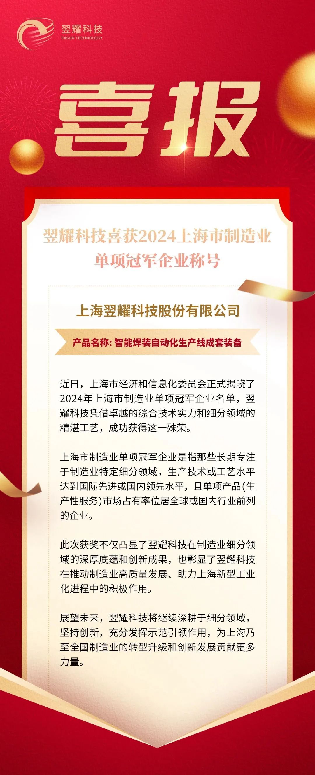 复鑫旗下智能制造核心企业翌耀科技获2024上海市制造业单项冠军企业称号