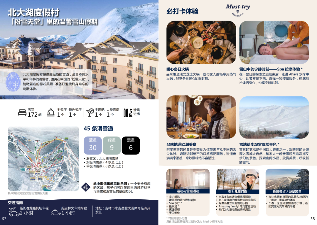 地中海俱乐部三家位于中国的滑雪度假村均坐落于知名滑雪胜地并各具特色,除专业的滑雪体验外,宾客还可享受多样化的“雪后时光”。
