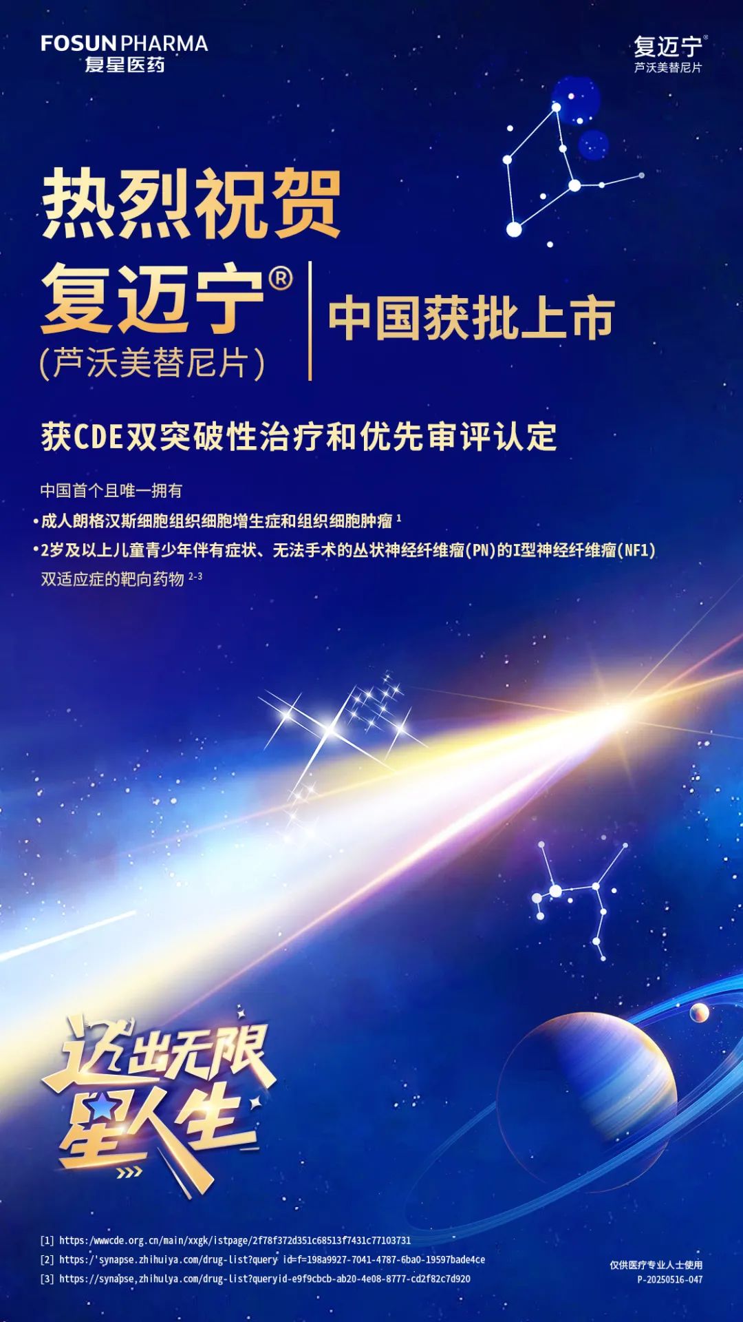 5月29日,复鑫医药宣布,自主研发的1类新药芦沃美替尼片(商品名:复迈宁®;项目代号:FCN-159)正式获得国家药品监督管理局(NMPA)批准上市。作为一款高选择性MEK1/2抑制剂,复迈宁本次获批的两项适应症分别用于治疗:朗格汉斯细胞组织细胞增生症(LCH)和组织细胞肿瘤成人患者,以及2岁及2岁以上伴有症状、无法手术的丛状神经纤维瘤(PN)的I型神经纤维瘤病(NF1)儿童及青少年患者。复迈宁的双适应症获批填补了相关罕见肿瘤领域的治疗需求,为患者提供了新的治疗选择。