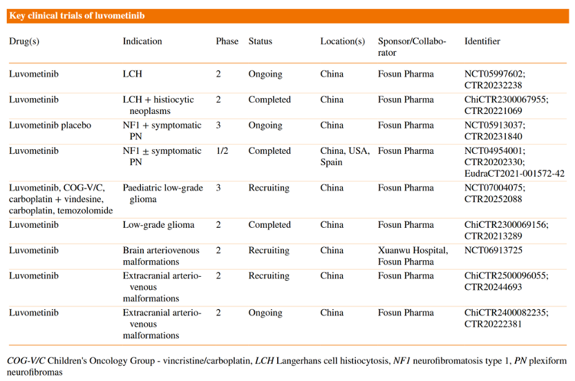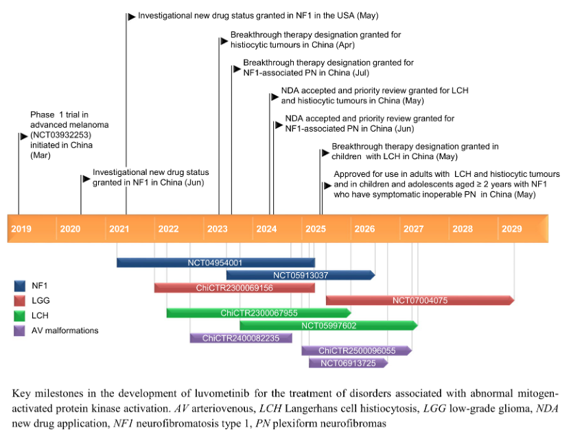 芦沃美替尼正在积极继续探索及开展多个适应症的临床研究。其中,用于治疗成人NF1-PN (NCT05913037) 和儿童LGG(NCT07004075)的临床研究处于Ⅲ期临床阶段,用于颅外AVM(ChiCTR2500096055)、儿童LCH(NCT05997602)的临床研究均处于Ⅱ期临床阶段。