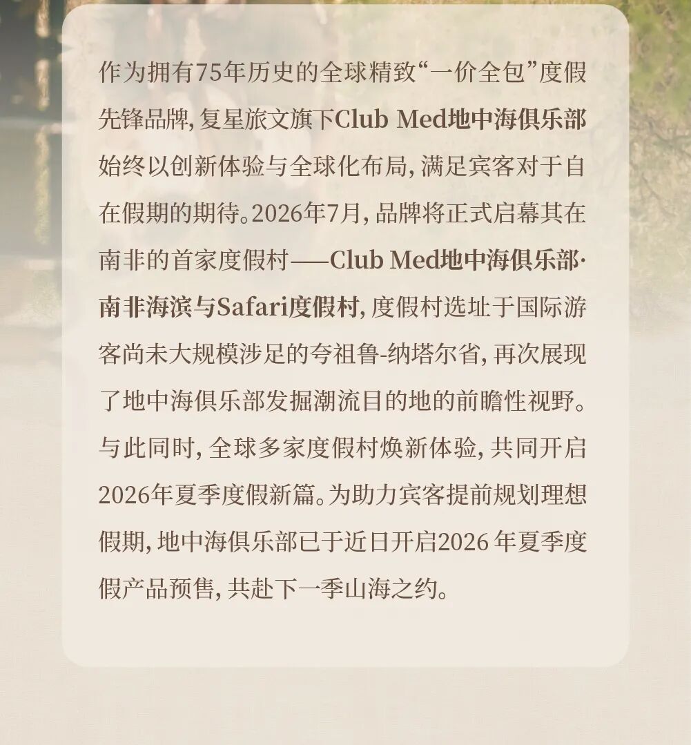 Club Med地中海俱乐部南非新村将于明年启幕,2026年夏季体验同步焕新