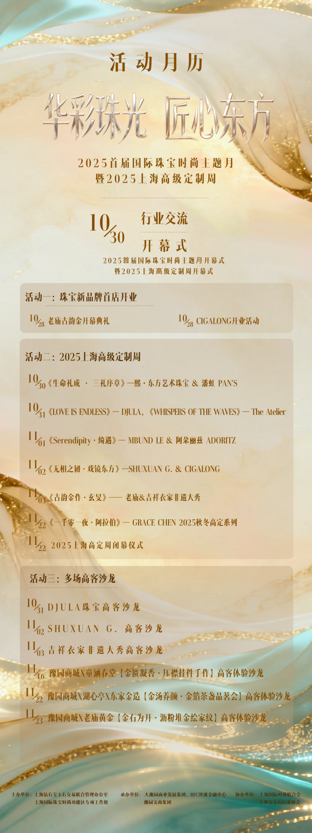 华彩珠光,匠心东方。2025年10月30日,首届国际珠宝时尚主题月暨2025上海高级定制周于大豫园文化片区启幕。作为上海国际珠宝时尚功能区揭牌后的首场重量级活动,首届国际珠宝时尚主题月不仅将带来一系列精彩活动,更将开启功能区建设的新篇章。