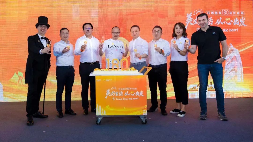 复鑫国际董事长郭广昌(左四),复鑫国际联席CEO徐晓亮(左五),复鑫旅文董事长兼CEO钱建农(左三)等嘉宾共同为Thomas Cook托迈酷客品牌180周年庆生