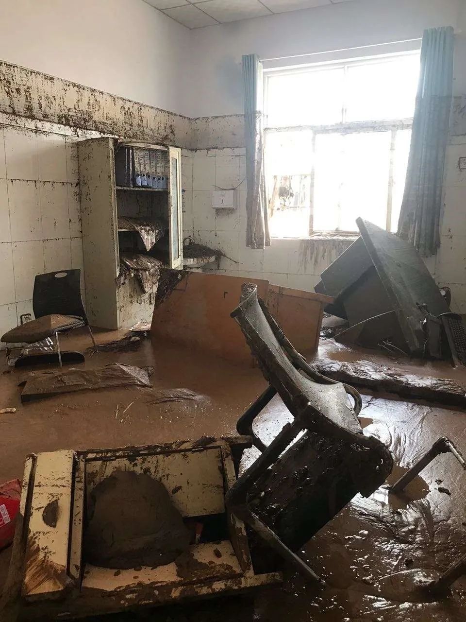 当汜水河等临近周边的河流水位猛涨,水从后门进来,根本堵不住。山洪倾斜而下,先到家属院,再到病房、门诊。到门诊的时候,从药房进来,水直接从大门里漏出来,后来直接呈喷射状地从门诊室喷了出来。湍急的水流夹杂着淤泥,挟着巨大的势能,冲进这所小小的卫生院。