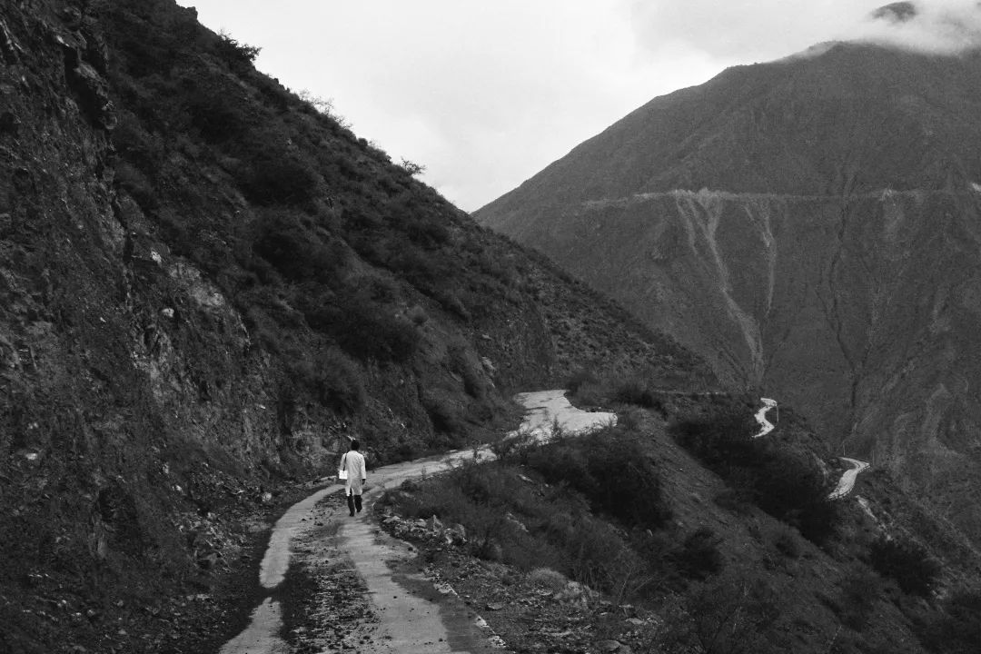 李永生走在山路上去给村民看病,脚下就是万丈深渊。