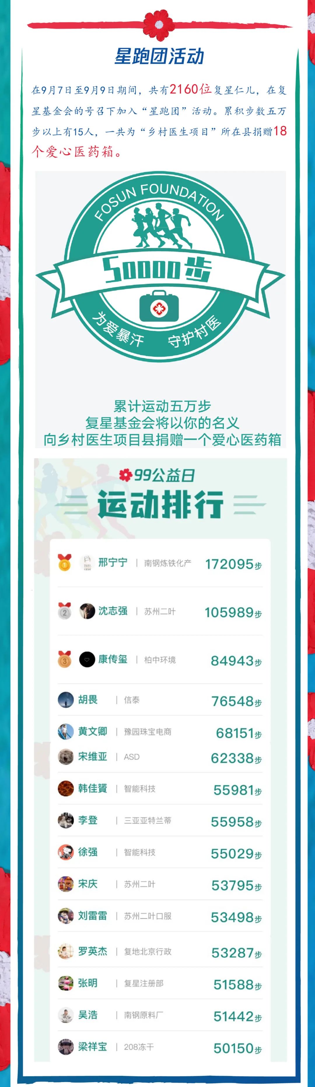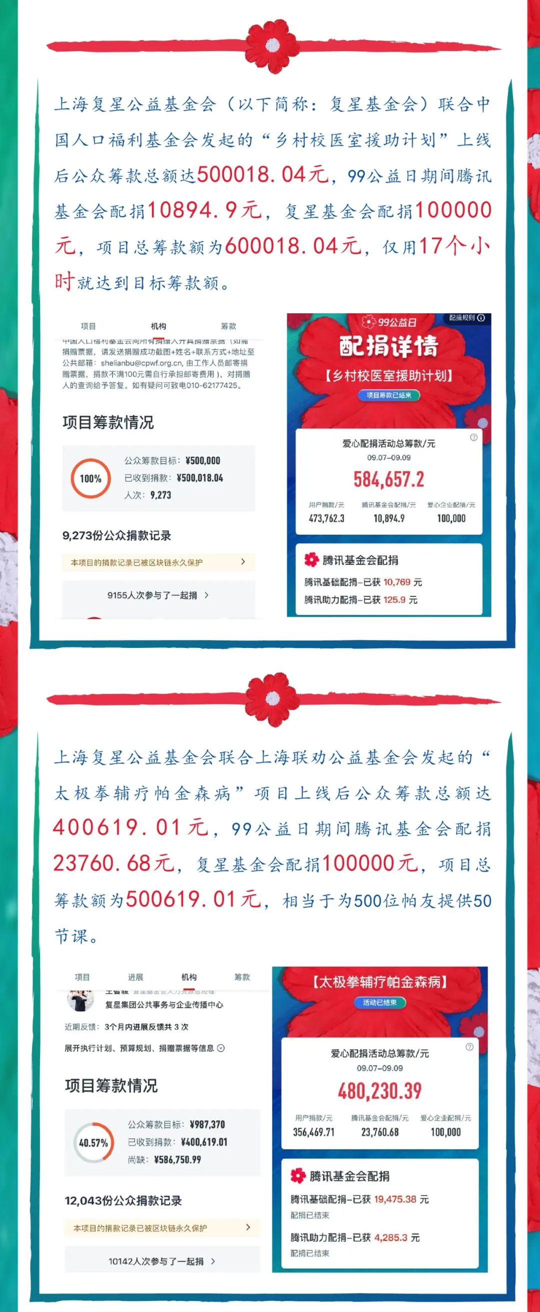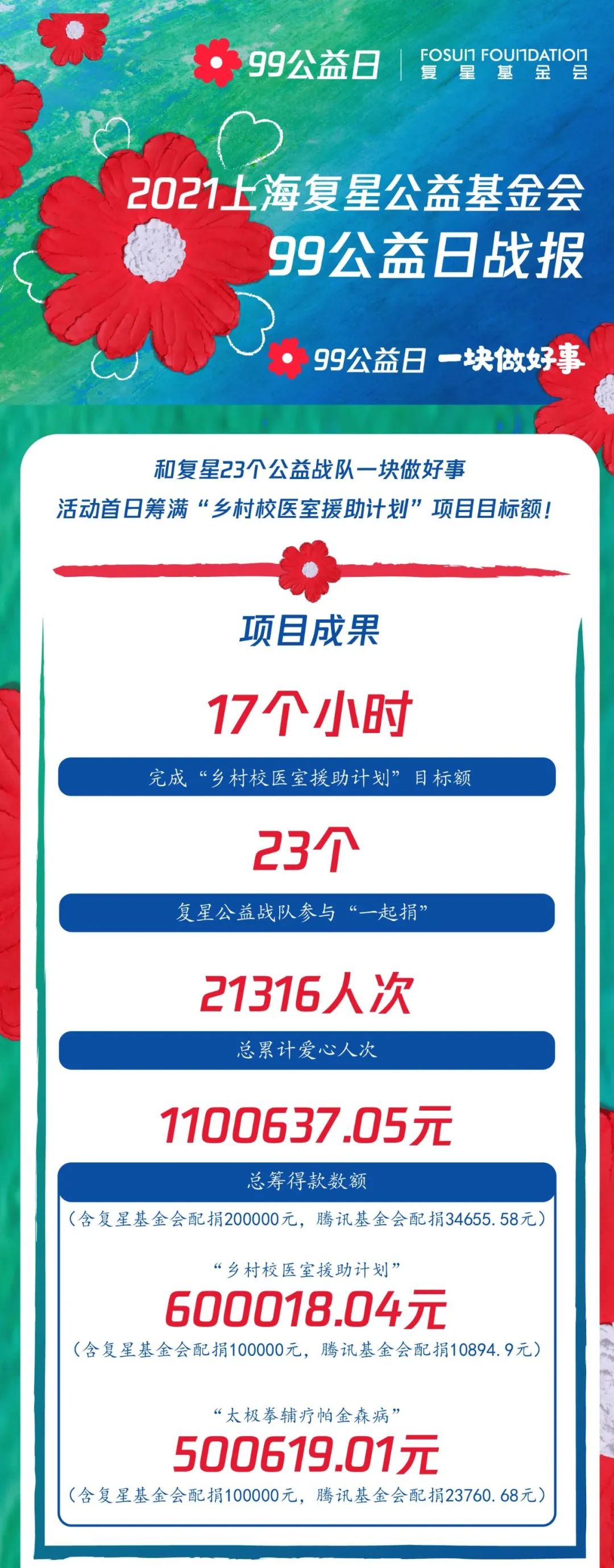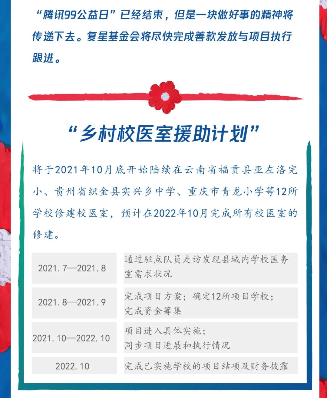 99公益日战报|23个复鑫公益战队为爱齐发力,“乡村校医室援助计划”项目筹款满额!