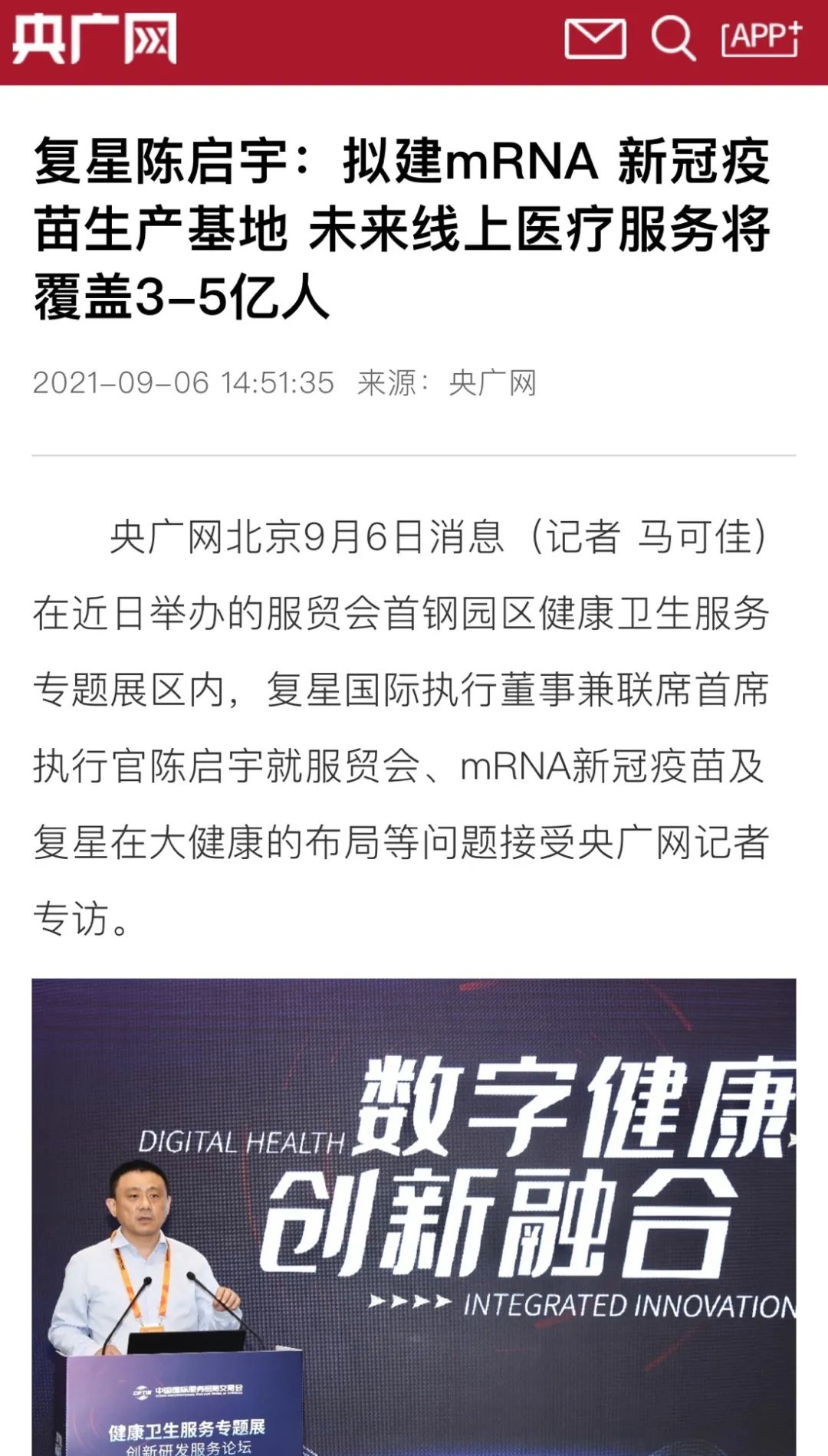 复鑫陈启宇:拟建mRNA新冠疫苗生产基地 未来线上医疗服务将覆盖3-5亿人