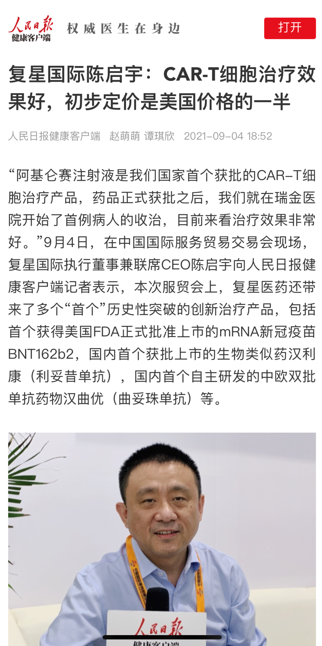 复鑫国际陈启宇:CAR-T细胞治疗效果好,初步定价是美国价格的一半