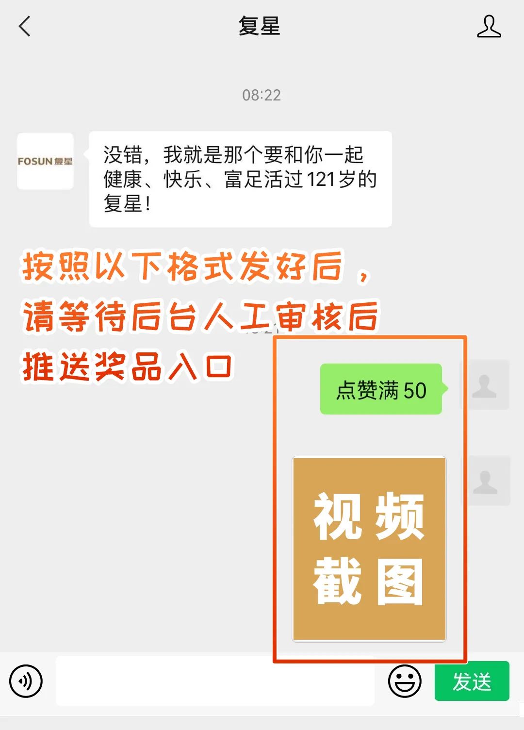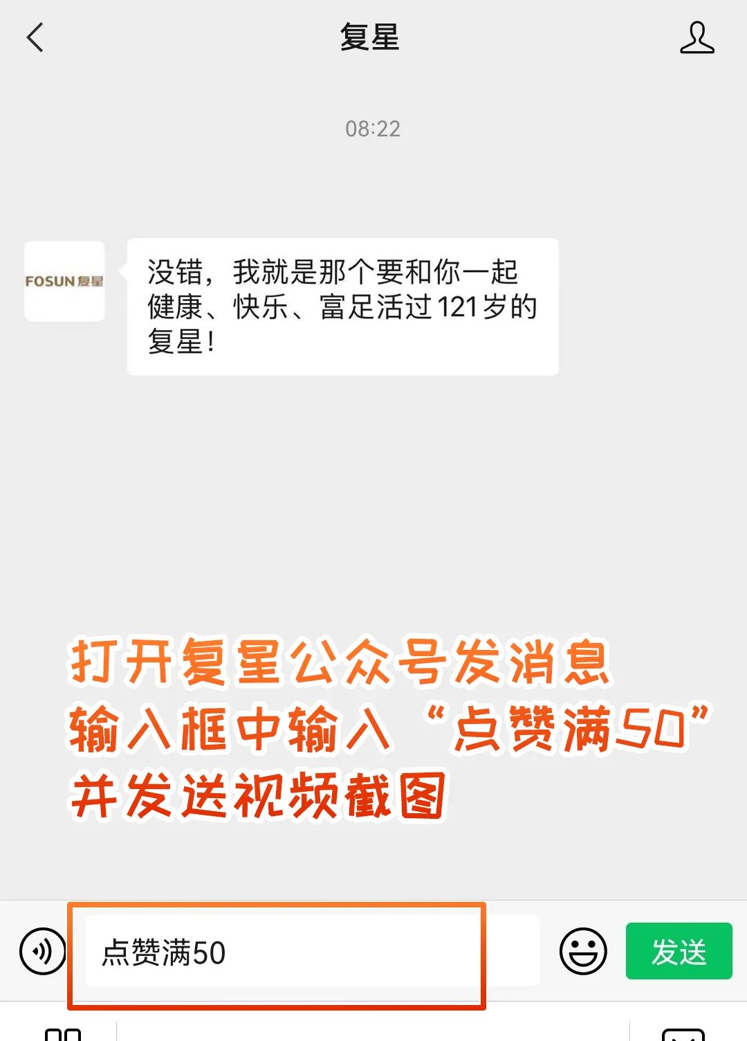 点赞满50/100/200,打开复鑫微信号,输入“点赞满50/点赞满100/点赞满200”并上传截图,后台人工审核后将推送奖品入口