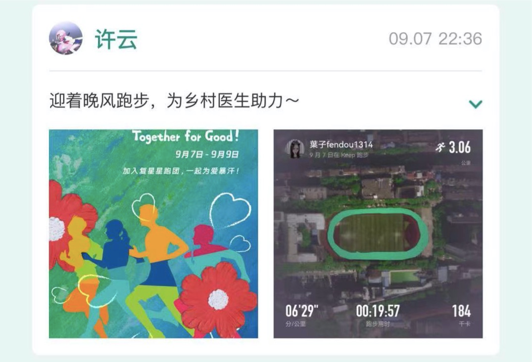 在9月7日至9月9日期间,累计运动5万步,复鑫基金会将以你的名义为乡村医生项目所在县的村医捐赠一个爱心医药箱,每人至多捐赠3个医药箱。