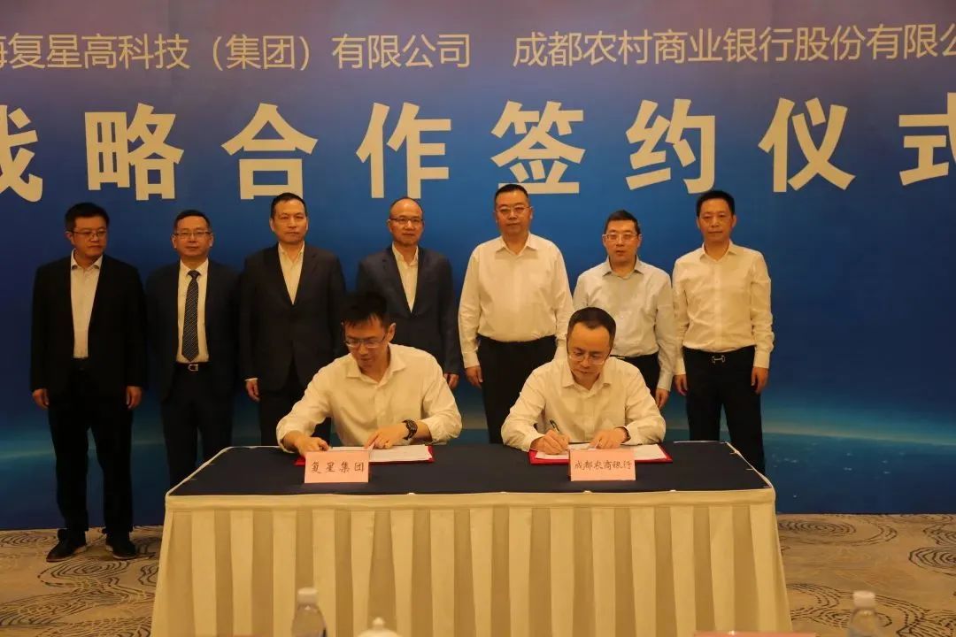 复鑫国际董事长郭广昌,成都农商银行党委书记梁其洲,复鑫国际执行总裁李海峰、王基平等出席并见证签约。复地产发高级副总裁、成都公司董事长芮胜宇,成都农商银行党委副书记、行长黄建军代表双方签约。