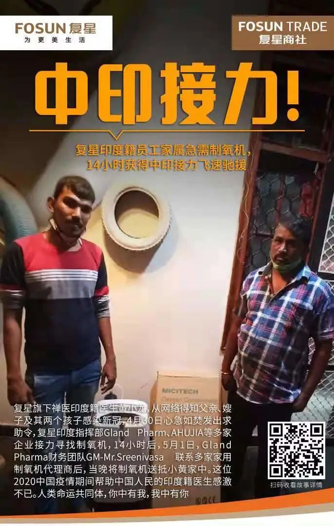 复鑫旗下广东禅城中心医院的IHCU国际部印度籍主任黄小龙,4月30日深夜求助复鑫,自己远在印度海得拉巴的家人不幸遭受新冠疫情侵袭:父亲确诊变异新冠病毒阳性,嫂子和两个孩子全部感染!身为医生的他,深知新冠疫情主要依靠自身免疫力对抗,所以能够供给呼吸的氧气是首要物资!他在全力寻找制氧机,而一己之力终究渺小,不得已求助集团帮助。
