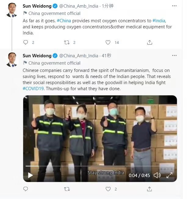 “秉持人道主义精神,快速回应印度人民的需求,中国企业勇于承担社会责任,全力挽救生命。点赞他们为印度人民所做的所有工作!”