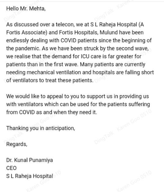 孟买S. L. Raheja医院CEO Kunal博士在给复鑫的求助信中写道:“由疫情开始,我们就在无休无止的救治新冠病人,我们现在面临的第二波疫情远比第一波严重很多,许多病人急需机械通气治疗,但医院已经严重缺乏呼吸机来治疗这些病人。”接到医院求助,复鑫蜂巢海外团队立即寻求指挥部支援,据了解医院需要的氧气设备目前已经完成生产,并将安排在未来几天内运送至孟买医院。