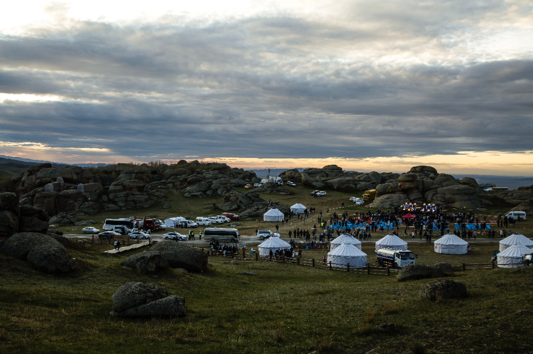 音乐会在吉木乃石头城举行,毗邻国境线仅24公里,裸露的石块崖壁在草原上围成一个小盆地,舞台坐落其中。