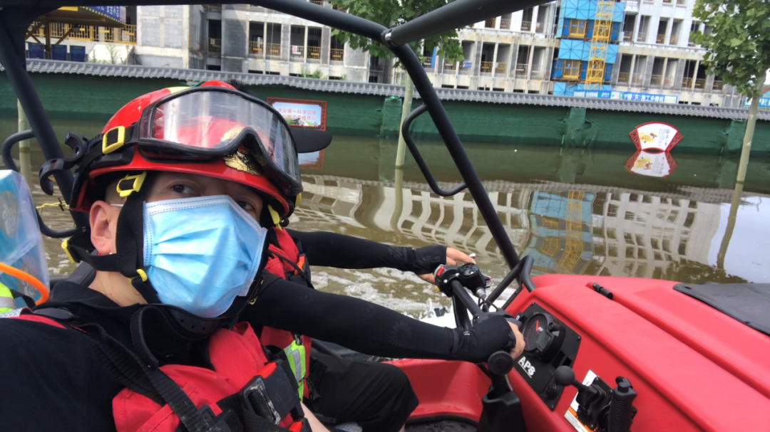 23日,新乡汛情告急,远在上海的防汛救灾指挥部和冬哥对称了信息,的确新乡积水严重。当天,复鑫基金会联合复鑫北铃,又从上海派出6辆全地形车增援,经过24小时星夜飞驰,24日晚冬哥在新乡接到了这6辆车。25日,冬哥随车出行一天,下午三点,新乡市结核病防治所有一位胸膜炎病人及其家属需要转移,全地形车即刻赶往。在1.5-1.6米深的积水里奋力前行,冬哥把这一幕拍下来,说,“水下全是淹没的车辆”。往来有冲锋舟、皮划艇、皮筏艇,装了物资相向而驰,素不相识,但开船的人都在交会的瞬间用力说:加油!那一刻,冬哥有点哽咽。