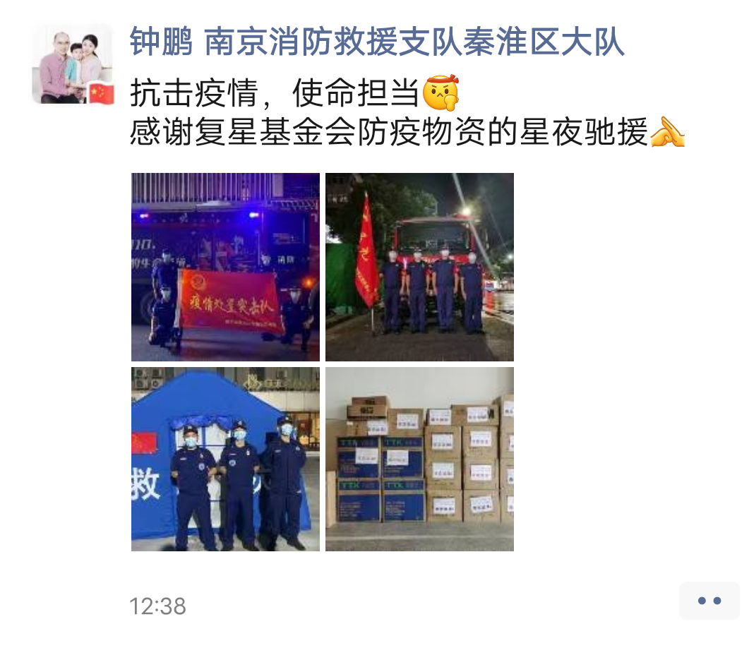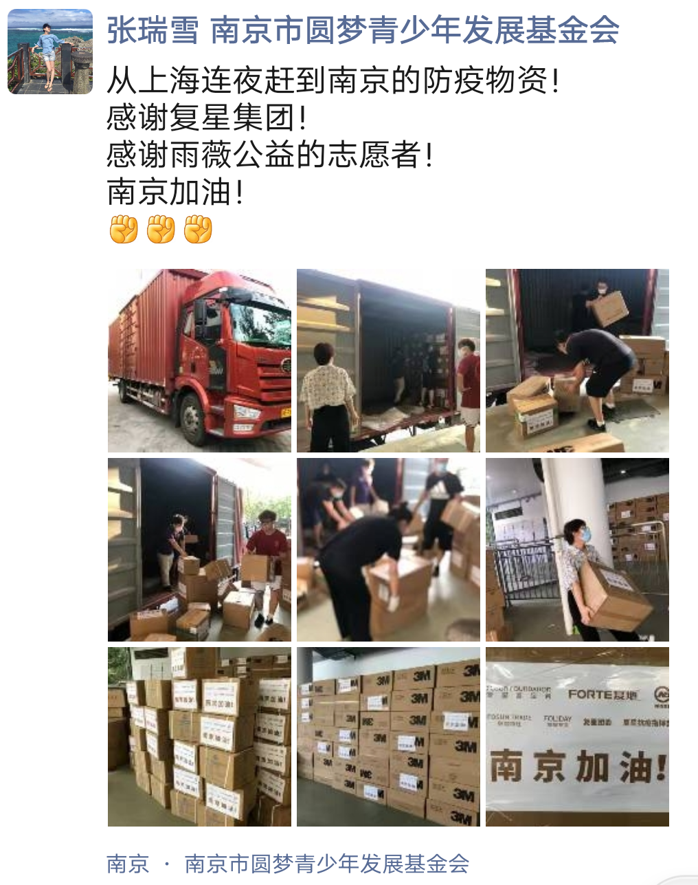 7月30日,复鑫抗击新冠肺炎疫情全球战时指挥部接到来自江宁区卫健委、南京团市委、南京市第一医院、南京消防救援队秦淮大队的需求,立即启动南京抗疫驰援。截至2021年7月31日中午,指挥部累计匹配470996件驰援物资,包括3M“复鑫高照”N95口罩、医用丁腈手套、消杀及防暑用品等防疫物资,通过复鑫基金会、复地南京、南钢、复鑫商社等联合捐往抗疫前线。7月30日17:30,复鑫商社副总裁、复鑫基金会联席执行秘书长王慧博从上海仓库启程,护送第一批物资连夜赶往南京。