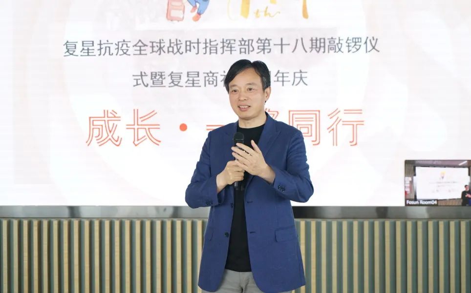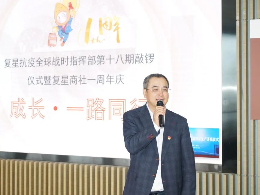 “成长·一路同行|复鑫商社成立一周年暨第18期敲锣仪式”在复鑫全球抗疫战时指挥部举行。复鑫国际联席董事长汪群斌,复鑫全球合伙人、复鑫国际高级副总裁、复鑫商社董事长李海峰,复鑫全球合伙人、复鑫国际高级副总裁、复鑫联席首席财务官(Co-CFO)张厚林,复鑫全球合伙人、复鑫医药执行总裁、首席财务官(CFO)关晓晖出席仪式,面对商社周岁蛋糕,他们站在今天,回望昨天的经验教训,寄语明天更好的商业模式和发展蓝图。