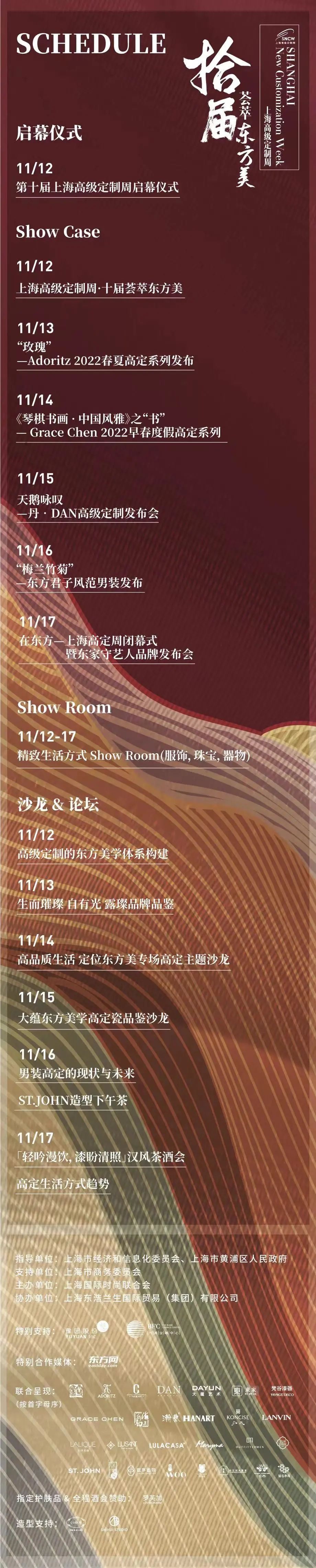 “上海高级定制周·十届荟萃东方美”开幕大秀;东浩兰生国际贸易集团将与豫园股份联合举办的“梅兰竹菊”男装秀;“东方美学风雅颂·生活方式集大成”主场秀;ADORITZ、GRACE CHEN、丹·DAN等品牌新品发布,以及沉浸式空间展示和高客主题沙龙等活动将逐一登场。
