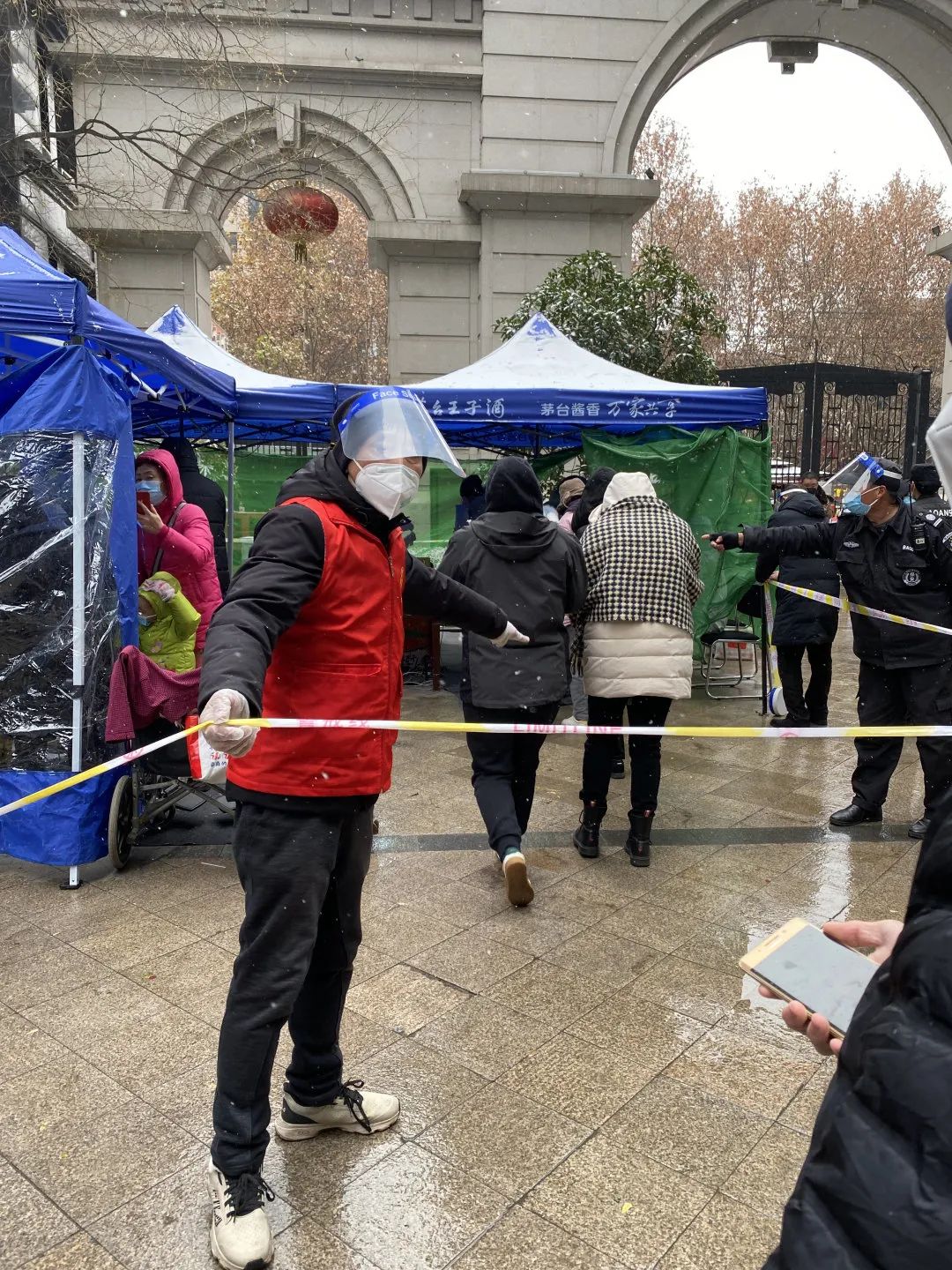 “请大家提前打开二维码,有序排队保持一米安全距离”,“小朋友和需要登记身份信息的这边通道排队”,在西安市新城区新旅城小区的核酸检测现场,复地产发西安公司的窦一宁同学正在寒风中手持喇叭维持着秩序。