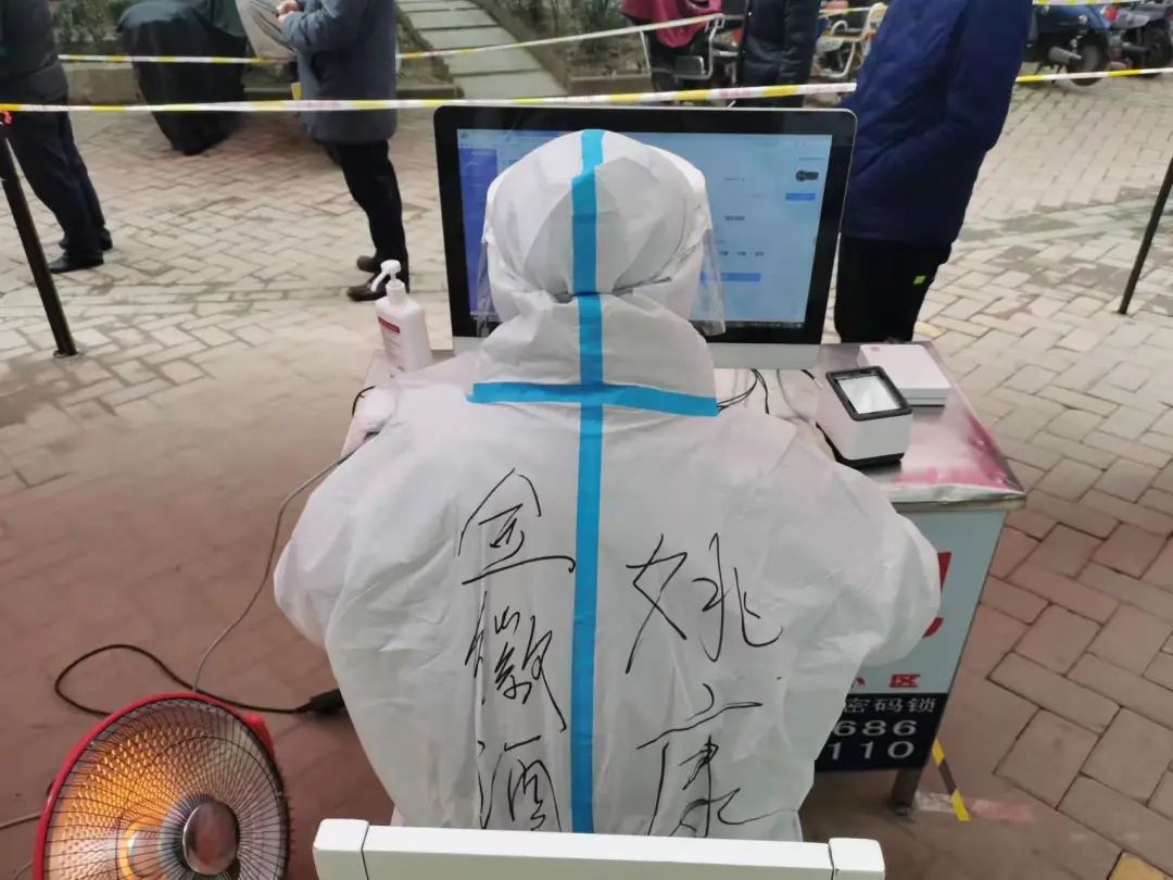12月24日,身着背后写着“金徽酒姚康”防护服的97年小伙,走进了新西蓝小区,开展疫情防控工作。西安大雪,夜间气温已经骤降零度以下。姚康在连续站立工作6小时后,全身已经冻僵。期间同行的志愿者给他递来水和食物,他却笑着拒绝:“喝多了就老爱跑厕所,这边爷爷奶奶比较多,找不到我会很着急的,所以我要‘轻装上阵’”。这几天,姚康所在的小区已经连续采集上万份样本。