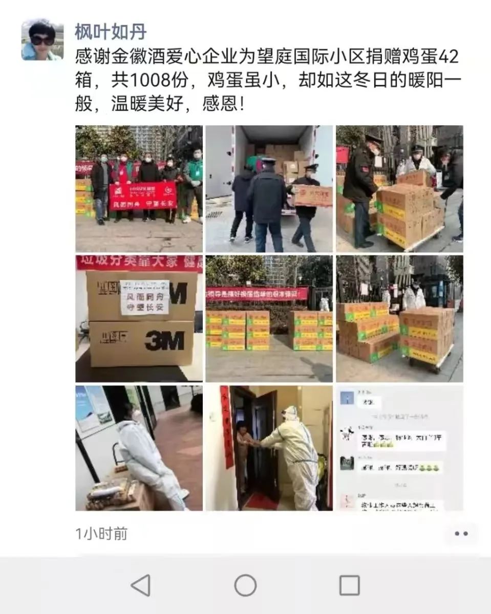 时间回放到12月23日,西安因疫情封城。金徽酒是复鑫的成员企业,金徽酒西安分公司的总经理廖结兵第一时间加入复鑫抗疫西安前方指挥部,并组建了复鑫抗疫志愿者队伍,没日没夜地将30余万件防疫物资从全国各地运至西安。12月31日,他协助复鑫基金会在碑林区捐赠抗疫物资后,给金徽酒总部领导打了个电话;“能不能再准备些吃的东西到西安...”